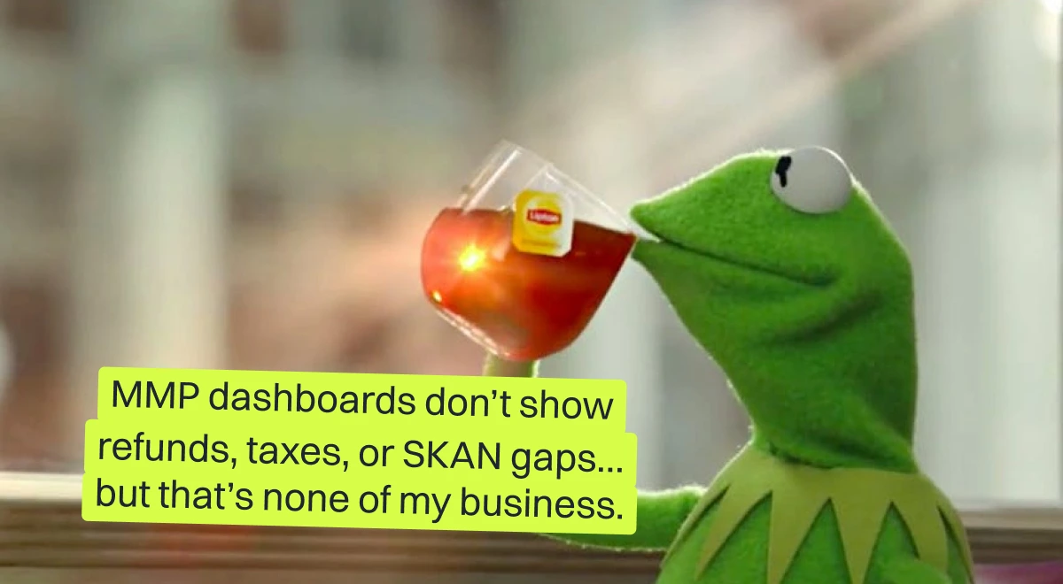 The trouble begins when you expect your MMP to do more than it’s built for. MMPs don’t model iOS attribution, they miss web-to-app and multi-touch attribution paths, and they don’t include refunds, taxes, or store fees. As a result, you have miscalculated unit economics and inflated ROAS that lead to poor budget allocation.